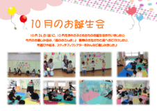10月24日(金)に10月生まれのお子さんのお誕生会を開催しました♪ 今月は、みんなで森へおさんぽにでかけてみたよ。 いろんな動物にであったり、 布遊びやスケッチブックシアターを みんなで楽しみました♪ 11月のお誕生会 […]
