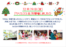 12月19日(金)に「クリスマス会」を開催しました! 今年もたくさんのご参加ありがとうございました。 当日はお子さんの顔写真を使った制作をしたり、 お楽しみ会はみんなで盛り上がりましたね。 プラザのスタッフからはハンドベ […]