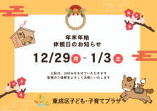 12月29日(月)~1月3日(土)は、年末年始のため休館しています。 1月4日(日)からは、通常どおり開館いたします。 2025年は、たくさんのご来館ありがとうございました★ 2026年もよろしくね!