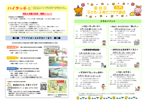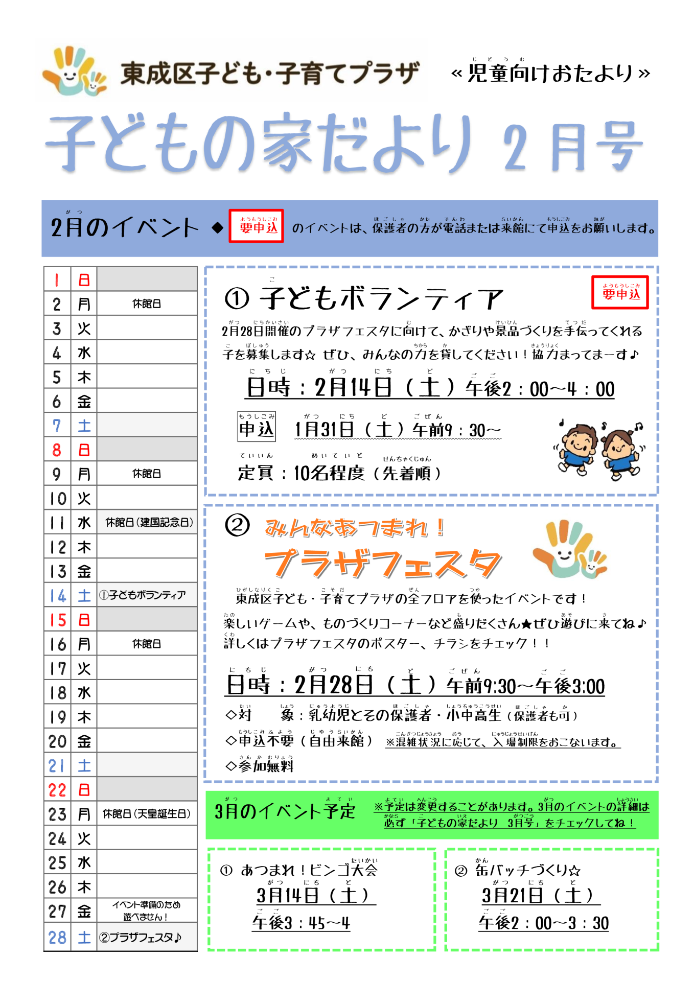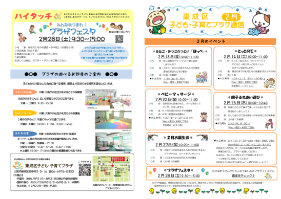 今年の『みんなあつまれ!プラザフェスタ』は、2月28日(土)9:30~15:00に開催します! 当日はプラザの職員だけでなく、東成区で子育てを応援する支援者さん一同が集合☆ 皆さんのご参加をお待ちしています♡ 【2026 […]