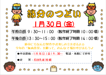 節分にちなんだ工作やお楽しみ会をします。 今年の「無病息災」をお願いしましょう☆ 【午前の部】 9:30~11:00 【午後の部】 13:30~15:00 ※午前の部11:00~と午後の部~13:30までは自由遊びとなり […]
