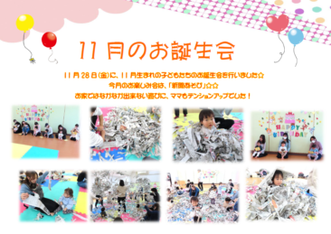 11月28日(金)に11月生まれのお子さんのお誕生会を開催しました♪ 今回はダイナミックに『新聞あそび』♪ 子どもだけでなく、ママたちにも楽しんでいただけました!
