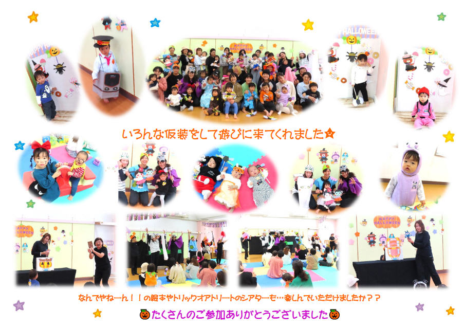 2025.11.01 新着 乳幼児 乳児 過去のイベント 【季節のイベント】ハロウィンのつどいを開催しました 「ハロウィンのつどい」を開催しました! たくさんの子ども達が、 かわいい仮装で遊びにきてくれました♪ 絵本やスケッチブックシアター、ふれあい遊びなども楽しみました! 最後はスタッフ総出演のモンスターショー★☆ みんなでハロウィンダンスを楽しみました! また、みんなで楽しみましょうね!! イベント・講座詳細情報 開催日 2025/10/31(金) 開催時間 申込期間 定員 対象 その他