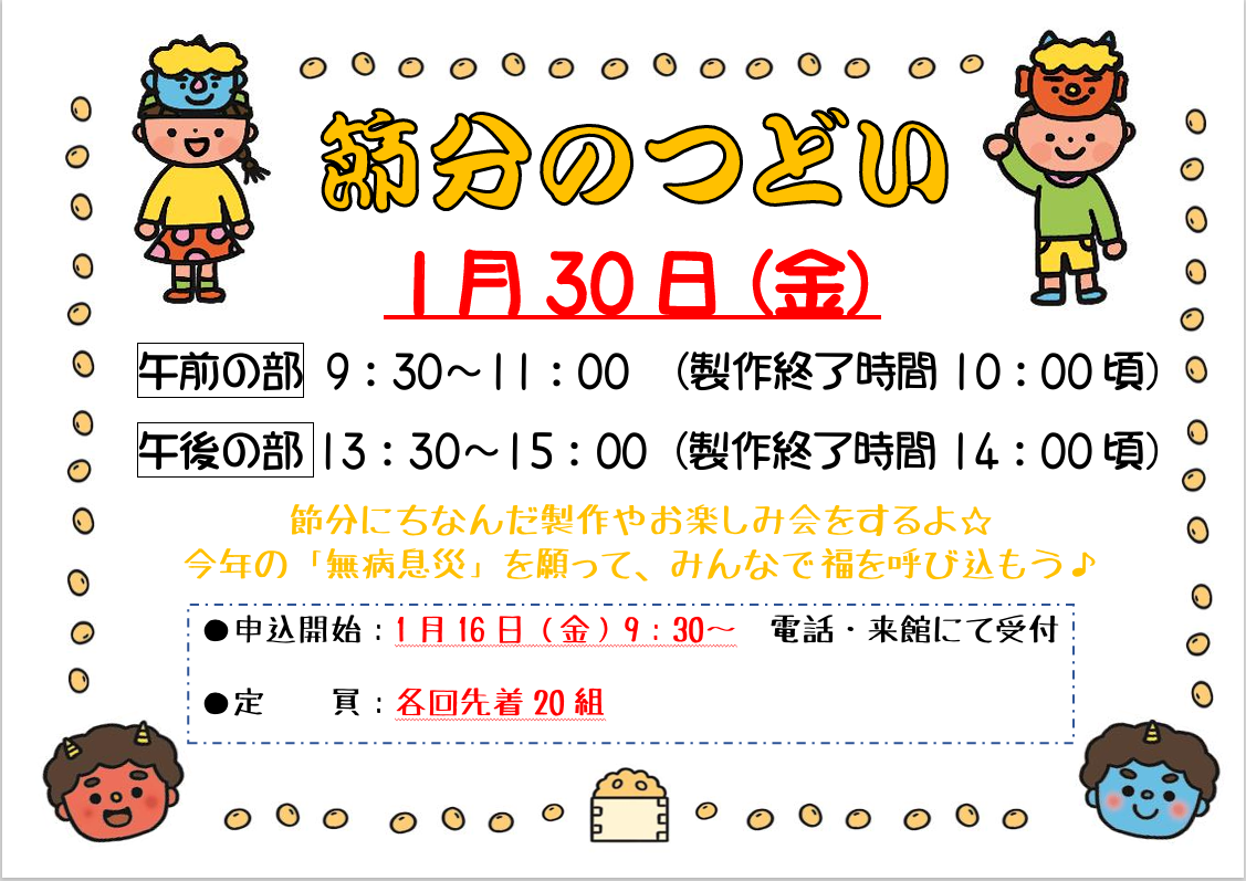 - 申込開始 1/16(金)9:30~ 電話・来館にて受付