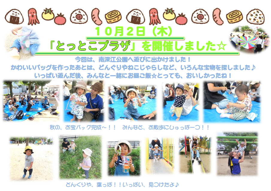 2025.10.07 乳幼児 乳児 過去のイベント 『とっとこプラザ』を開催しました♪ お天気にも恵まれ、10月2日(木)に 南深江公園にて『とっとこプラザ』を開催しました♪ みんなで製作やお散歩、パラバルーンで遊びました! また、みんなでお外遊びしましょうね✨ イベント・講座詳細情報 開催日 開催時間 申込期間 定員 対象 その他
