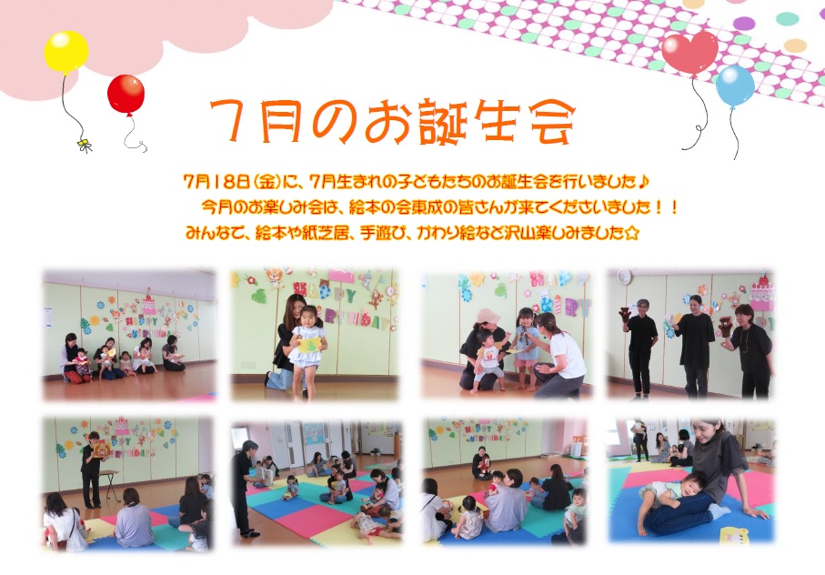 2025.07.26 乳幼児 乳児 過去のイベント 7月のお誕生会を開催しました✨ 7月生まれのお子さんのお誕生会を開催しました♪ イベント・講座詳細情報 開催日 開催時間 申込期間 定員 対象 その他