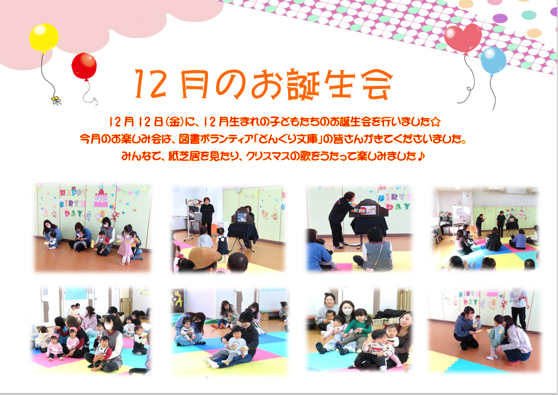 2025.12.12 乳幼児 乳児 過去のイベント 12月のお誕生会を開催しました✨ 12月12日(金)に12月生まれのお子さんのお誕生会を開催しました♪ 今回は、図書ボランティア「どんぐり文庫」の 皆さんがきてくださいました♪ 子どもだけでなく、ママたちにも楽しんでいただけました! イベント・講座詳細情報 開催日 開催時間 申込期間 定員 対象 その他