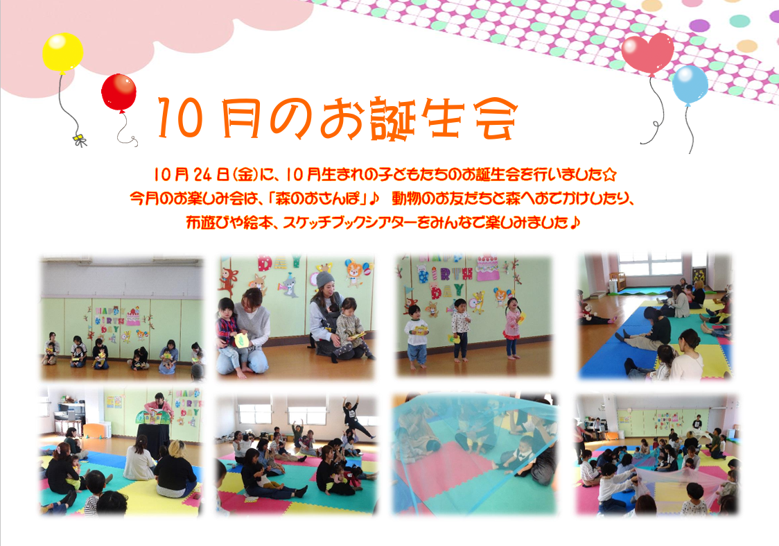 2025.10.24 新着 乳幼児 乳児 過去のイベント 10月のお誕生会を開催しました✨ 10月24日(金)に10月生まれのお子さんのお誕生会を開催しました♪ 今月は、みんなで森へおさんぽにでかけてみたよ。 いろんな動物にであったり、 布遊びやスケッチブックシアターを みんなで楽しみました♪ 11月のお誕生会は11月28日(金)です。是非、ご参加ください♪ イベント・講座詳細情報 開催日 開催時間 申込期間 定員 対象 その他