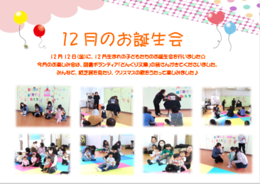 12月12日(金)に12月生まれのお子さんのお誕生会を開催しました♪ 今回は、図書ボランティア「どんぐり文庫」の 皆さんがきてくださいました♪ 子どもだけでなく、ママたちにも楽しんでいただけました!